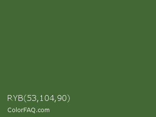 RYB 53,104,90 Color is a normal green color and the nearest color is Chalet Green #516e3d. Hex code #436835 and RGB value is rgb(67,104,53). In RGB color space, this color is composed of 26% red, 41% green, 21% blue, In CMYK color space, this color is composed of 36% cyan, 0% magenta, 49% yellow , 59% black , In HSL color space, this color has a hue angle of 104° , 32% saturation and 31% lightness.