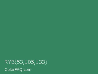 RYB 53,105,133 Color is a normal green color and the nearest color is Sea Green #2e8b57. Hex code #358560 and RGB value is rgb(53,133,96). In RGB color space, this color is composed of 21% red, 52% green, 38% blue, In CMYK color space, this color is composed of 60% cyan, 0% magenta, 28% yellow , 48% black , In HSL color space, this color has a hue angle of 152° , 43% saturation and 36% lightness.