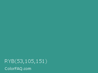 RYB 53,105,151 Color is a normal cyan color and the nearest color is Lochinvar #2c8c84. Hex code #35978c and RGB value is rgb(53,151,140). In RGB color space, this color is composed of 21% red, 59% green, 55% blue, In CMYK color space, this color is composed of 65% cyan, 0% magenta, 7% yellow , 41% black , In HSL color space, this color has a hue angle of 173° , 48% saturation and 40% lightness.