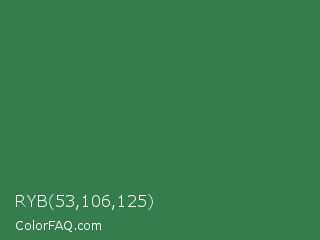 RYB 53,106,125 Color is a normal green color and the nearest color is Goblin #3d7d52. Hex code #357d4f and RGB value is rgb(53,125,79). In RGB color space, this color is composed of 21% red, 49% green, 31% blue, In CMYK color space, this color is composed of 58% cyan, 0% magenta, 37% yellow , 51% black , In HSL color space, this color has a hue angle of 142° , 40% saturation and 35% lightness.