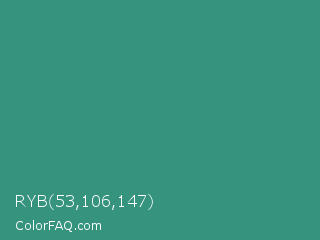 RYB 53,106,147 Color is a normal cyan color and the nearest color is Illuminating Emerald #319177. Hex code #35937e and RGB value is rgb(53,147,126). In RGB color space, this color is composed of 21% red, 58% green, 49% blue, In CMYK color space, this color is composed of 64% cyan, 0% magenta, 14% yellow , 42% black , In HSL color space, this color has a hue angle of 167° , 47% saturation and 39% lightness.