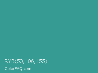 RYB 53,106,155 Color is a normal cyan color and the nearest color is Zomp #39a78e. Hex code #359b93 and RGB value is rgb(53,155,147). In RGB color space, this color is composed of 21% red, 61% green, 58% blue, In CMYK color space, this color is composed of 66% cyan, 0% magenta, 5% yellow , 39% black , In HSL color space, this color has a hue angle of 175° , 49% saturation and 41% lightness.