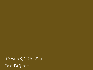 RYB 53,106,21 Color is a dark orange color and the nearest color is West Coast #625119. Hex code #6a5315 and RGB value is rgb(106,83,21). In RGB color space, this color is composed of 42% red, 33% green, 8% blue, In CMYK color space, this color is composed of 0% cyan, 22% magenta, 80% yellow , 58% black , In HSL color space, this color has a hue angle of 44° , 67% saturation and 25% lightness.