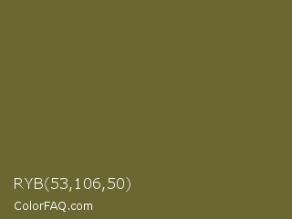 RYB 53,106,50 Color is a normal yellow color and the nearest color is Yellow Metal #716338. Hex code #6a6732 and RGB value is rgb(106,103,50). In RGB color space, this color is composed of 42% red, 40% green, 20% blue, In CMYK color space, this color is composed of 0% cyan, 3% magenta, 53% yellow , 58% black , In HSL color space, this color has a hue angle of 57° , 36% saturation and 31% lightness.