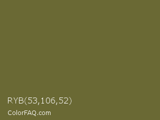 RYB 53,106,52 Color is a normal yellow color and the nearest color is Yellow Metal #716338. Hex code #6a6934 and RGB value is rgb(106,105,52). In RGB color space, this color is composed of 42% red, 41% green, 20% blue, In CMYK color space, this color is composed of 0% cyan, 1% magenta, 51% yellow , 58% black , In HSL color space, this color has a hue angle of 59° , 34% saturation and 31% lightness.