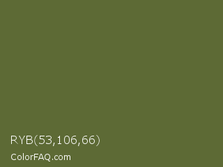 RYB 53,106,66 Color is a normal lime color and the nearest color is Dark Olive Green #556b2f. Hex code #5d6a35 and RGB value is rgb(93,106,53). In RGB color space, this color is composed of 36% red, 42% green, 21% blue, In CMYK color space, this color is composed of 12% cyan, 0% magenta, 50% yellow , 58% black , In HSL color space, this color has a hue angle of 75° , 33% saturation and 31% lightness.