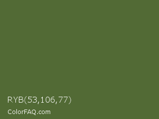 RYB 53,106,77 Color is a normal green color and the nearest color is Dark Olive Green #556b2f. Hex code #526a35 and RGB value is rgb(82,106,53). In RGB color space, this color is composed of 32% red, 42% green, 21% blue, In CMYK color space, this color is composed of 23% cyan, 0% magenta, 50% yellow , 58% black , In HSL color space, this color has a hue angle of 87° , 33% saturation and 31% lightness.