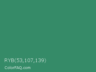 RYB 53,107,139 Color is a normal green color and the nearest color is Viridian #40826d. Hex code #358b68 and RGB value is rgb(53,139,104). In RGB color space, this color is composed of 21% red, 55% green, 41% blue, In CMYK color space, this color is composed of 62% cyan, 0% magenta, 25% yellow , 45% black , In HSL color space, this color has a hue angle of 156° , 45% saturation and 38% lightness.