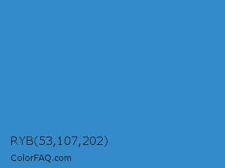 RYB 53,107,202 Color is a normal blue color and the nearest color is Curious Blue #2596d1. Hex code #358aca and RGB value is rgb(53,138,202). In RGB color space, this color is composed of 21% red, 54% green, 79% blue, In CMYK color space, this color is composed of 74% cyan, 32% magenta, 0% yellow , 21% black , In HSL color space, this color has a hue angle of 206° , 58% saturation and 50% lightness.