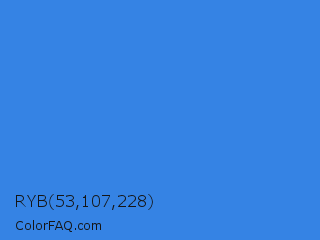 RYB 53,107,228 Color is a normal blue color and the nearest color is Bleu De France #318ce7. Hex code #3583e4 and RGB value is rgb(53,131,228). In RGB color space, this color is composed of 21% red, 51% green, 89% blue, In CMYK color space, this color is composed of 77% cyan, 43% magenta, 0% yellow , 11% black , In HSL color space, this color has a hue angle of 213° , 76% saturation and 55% lightness.