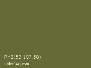 RYB 53,107,58 Color is a normal yellow color and the nearest color is Yellow Metal #716338. Hex code #666b35 and RGB value is rgb(102,107,53). In RGB color space, this color is composed of 40% red, 42% green, 21% blue, In CMYK color space, this color is composed of 5% cyan, 0% magenta, 50% yellow , 58% black , In HSL color space, this color has a hue angle of 66° , 34% saturation and 31% lightness.