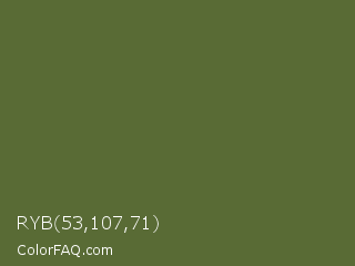 RYB 53,107,71 Color is a normal green color and the nearest color is Dark Olive Green #556b2f. Hex code #596b35 and RGB value is rgb(89,107,53). In RGB color space, this color is composed of 35% red, 42% green, 21% blue, In CMYK color space, this color is composed of 17% cyan, 0% magenta, 50% yellow , 58% black , In HSL color space, this color has a hue angle of 80° , 34% saturation and 31% lightness.