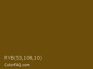 RYB 53,108,10 Color is a dark orange color and the nearest color is Antique Bronze #704a07. Hex code #6c4e0a and RGB value is rgb(108,78,10). In RGB color space, this color is composed of 42% red, 31% green, 4% blue, In CMYK color space, this color is composed of 0% cyan, 28% magenta, 91% yellow , 58% black , In HSL color space, this color has a hue angle of 42° , 83% saturation and 23% lightness.