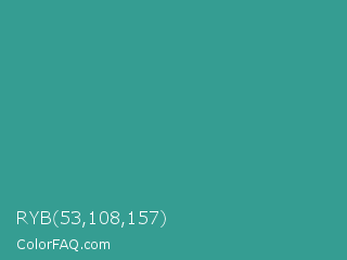 RYB 53,108,157 Color is a normal cyan color and the nearest color is Zomp #39a78e. Hex code #359d92 and RGB value is rgb(53,157,146). In RGB color space, this color is composed of 21% red, 62% green, 57% blue, In CMYK color space, this color is composed of 66% cyan, 0% magenta, 7% yellow , 38% black , In HSL color space, this color has a hue angle of 174° , 50% saturation and 41% lightness.