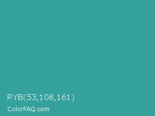RYB 53,108,161 Color is a normal cyan color and the nearest color is Keppel #3ab09e. Hex code #35a19d and RGB value is rgb(53,161,157). In RGB color space, this color is composed of 21% red, 63% green, 62% blue, In CMYK color space, this color is composed of 67% cyan, 0% magenta, 2% yellow , 37% black , In HSL color space, this color has a hue angle of 178° , 50% saturation and 42% lightness.