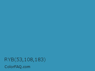 RYB 53,108,183 Color is a normal blue color and the nearest color is Boston Blue #3b91b4. Hex code #3594b7 and RGB value is rgb(53,148,183). In RGB color space, this color is composed of 21% red, 58% green, 72% blue, In CMYK color space, this color is composed of 71% cyan, 19% magenta, 0% yellow , 28% black , In HSL color space, this color has a hue angle of 196° , 55% saturation and 46% lightness.