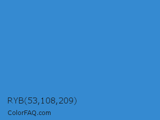 RYB 53,108,209 Color is a normal blue color and the nearest color is Tufts Blue #3e8ede. Hex code #358ad1 and RGB value is rgb(53,138,209). In RGB color space, this color is composed of 21% red, 54% green, 82% blue, In CMYK color space, this color is composed of 75% cyan, 34% magenta, 0% yellow , 18% black , In HSL color space, this color has a hue angle of 207° , 63% saturation and 51% lightness.