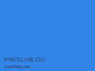 RYB 53,108,232 Color is a normal blue color and the nearest color is Bleu De France #318ce7. Hex code #3584e8 and RGB value is rgb(53,132,232). In RGB color space, this color is composed of 21% red, 52% green, 91% blue, In CMYK color space, this color is composed of 77% cyan, 43% magenta, 0% yellow , 9% black , In HSL color space, this color has a hue angle of 214° , 80% saturation and 56% lightness.
