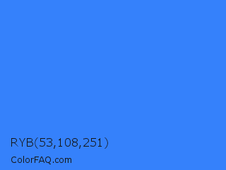 RYB 53,108,251 Color is a normal blue color and the nearest color is Bleu De France #318ce7. Hex code #3581fb and RGB value is rgb(53,129,251). In RGB color space, this color is composed of 21% red, 51% green, 98% blue, In CMYK color space, this color is composed of 79% cyan, 49% magenta, 0% yellow , 2% black , In HSL color space, this color has a hue angle of 217° , 96% saturation and 60% lightness.