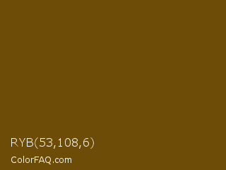 RYB 53,108,6 Color is a very dark orange color and the nearest color is Antique Bronze #704a07. Hex code #6c4c06 and RGB value is rgb(108,76,6). In RGB color space, this color is composed of 42% red, 30% green, 2% blue, In CMYK color space, this color is composed of 0% cyan, 30% magenta, 94% yellow , 58% black , In HSL color space, this color has a hue angle of 41° , 89% saturation and 22% lightness.