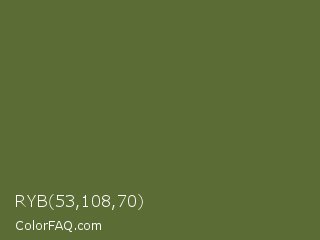 RYB 53,108,70 Color is a normal lime color and the nearest color is Dark Olive Green #556b2f. Hex code #5b6c35 and RGB value is rgb(91,108,53). In RGB color space, this color is composed of 36% red, 42% green, 21% blue, In CMYK color space, this color is composed of 16% cyan, 0% magenta, 51% yellow , 58% black , In HSL color space, this color has a hue angle of 79° , 34% saturation and 32% lightness.
