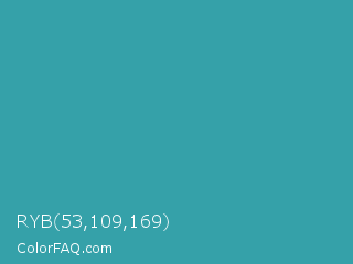 RYB 53,109,169 Color is a normal cyan color and the nearest color is Keppel #3ab09e. Hex code #35a1a9 and RGB value is rgb(53,161,169). In RGB color space, this color is composed of 21% red, 63% green, 66% blue, In CMYK color space, this color is composed of 69% cyan, 5% magenta, 0% yellow , 34% black , In HSL color space, this color has a hue angle of 184° , 52% saturation and 44% lightness.