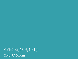RYB 53,109,171 Color is a normal cyan color and the nearest color is Boston Blue #3b91b4. Hex code #35a0ab and RGB value is rgb(53,160,171). In RGB color space, this color is composed of 21% red, 63% green, 67% blue, In CMYK color space, this color is composed of 69% cyan, 6% magenta, 0% yellow , 33% black , In HSL color space, this color has a hue angle of 186° , 53% saturation and 44% lightness.