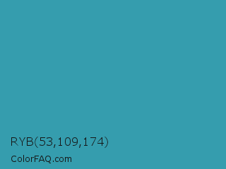 RYB 53,109,174 Color is a normal cyan color and the nearest color is Boston Blue #3b91b4. Hex code #359dae and RGB value is rgb(53,157,174). In RGB color space, this color is composed of 21% red, 62% green, 68% blue, In CMYK color space, this color is composed of 70% cyan, 10% magenta, 0% yellow , 32% black , In HSL color space, this color has a hue angle of 188° , 53% saturation and 45% lightness.
