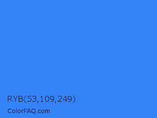 RYB 53,109,249 Color is a normal blue color and the nearest color is Bleu De France #318ce7. Hex code #3583f9 and RGB value is rgb(53,131,249). In RGB color space, this color is composed of 21% red, 51% green, 98% blue, In CMYK color space, this color is composed of 79% cyan, 47% magenta, 0% yellow , 2% black , In HSL color space, this color has a hue angle of 216° , 94% saturation and 59% lightness.