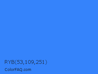 RYB 53,109,251 Color is a normal blue color and the nearest color is Bleu De France #318ce7. Hex code #3583fb and RGB value is rgb(53,131,251). In RGB color space, this color is composed of 21% red, 51% green, 98% blue, In CMYK color space, this color is composed of 79% cyan, 48% magenta, 0% yellow , 2% black , In HSL color space, this color has a hue angle of 216° , 96% saturation and 60% lightness.