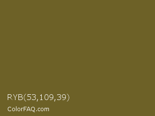 RYB 53,109,39 Color is a dark yellow color and the nearest color is Antique Bronze #665d1e. Hex code #6d6127 and RGB value is rgb(109,97,39). In RGB color space, this color is composed of 43% red, 38% green, 15% blue, In CMYK color space, this color is composed of 0% cyan, 11% magenta, 64% yellow , 57% black , In HSL color space, this color has a hue angle of 50° , 47% saturation and 29% lightness.