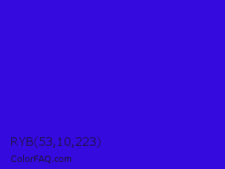 RYB 53,10,223 Color is a normal indigo color and the nearest color is Interdimensional Blue #360ccc. Hex code #350adf and RGB value is rgb(53,10,223). In RGB color space, this color is composed of 21% red, 4% green, 87% blue, In CMYK color space, this color is composed of 76% cyan, 96% magenta, 0% yellow , 13% black , In HSL color space, this color has a hue angle of 252° , 91% saturation and 46% lightness.