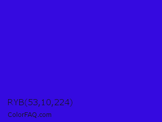 RYB 53,10,224 Color is a normal indigo color and the nearest color is Interdimensional Blue #360ccc. Hex code #350ae0 and RGB value is rgb(53,10,224). In RGB color space, this color is composed of 21% red, 4% green, 88% blue, In CMYK color space, this color is composed of 76% cyan, 96% magenta, 0% yellow , 12% black , In HSL color space, this color has a hue angle of 252° , 91% saturation and 46% lightness.