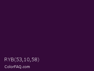 RYB 53,10,58 Color is a very dark magenta color and the nearest color is Valentino #350e42. Hex code #350a3a and RGB value is rgb(53,10,58). In RGB color space, this color is composed of 21% red, 4% green, 23% blue, In CMYK color space, this color is composed of 9% cyan, 83% magenta, 0% yellow , 77% black , In HSL color space, this color has a hue angle of 294° , 71% saturation and 13% lightness.