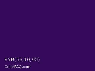 RYB 53,10,90 Color is a very dark purple color and the nearest color is Jagger #350e57. Hex code #350a5a and RGB value is rgb(53,10,90). In RGB color space, this color is composed of 21% red, 4% green, 35% blue, In CMYK color space, this color is composed of 41% cyan, 89% magenta, 0% yellow , 65% black , In HSL color space, this color has a hue angle of 272° , 80% saturation and 20% lightness.