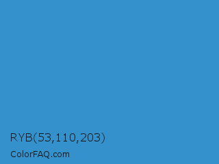 RYB 53,110,203 Color is a normal blue color and the nearest color is Curious Blue #2596d1. Hex code #3591cb and RGB value is rgb(53,145,203). In RGB color space, this color is composed of 21% red, 57% green, 80% blue, In CMYK color space, this color is composed of 74% cyan, 29% magenta, 0% yellow , 20% black , In HSL color space, this color has a hue angle of 203° , 59% saturation and 50% lightness.