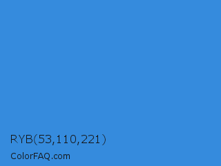 RYB 53,110,221 Color is a normal blue color and the nearest color is Tufts Blue #3e8ede. Hex code #358bdd and RGB value is rgb(53,139,221). In RGB color space, this color is composed of 21% red, 55% green, 87% blue, In CMYK color space, this color is composed of 76% cyan, 37% magenta, 0% yellow , 13% black , In HSL color space, this color has a hue angle of 209° , 71% saturation and 54% lightness.