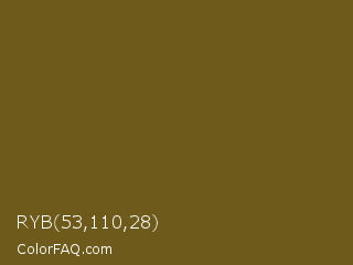 RYB 53,110,28 Color is a dark yellow color and the nearest color is Himalaya #6a5d1b. Hex code #6e5b1c and RGB value is rgb(110,91,28). In RGB color space, this color is composed of 43% red, 36% green, 11% blue, In CMYK color space, this color is composed of 0% cyan, 17% magenta, 75% yellow , 57% black , In HSL color space, this color has a hue angle of 46° , 59% saturation and 27% lightness.