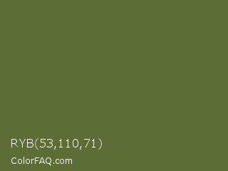 RYB 53,110,71 Color is a normal lime color and the nearest color is Dark Olive Green #556b2f. Hex code #5c6e35 and RGB value is rgb(92,110,53). In RGB color space, this color is composed of 36% red, 43% green, 21% blue, In CMYK color space, this color is composed of 16% cyan, 0% magenta, 52% yellow , 57% black , In HSL color space, this color has a hue angle of 79° , 35% saturation and 32% lightness.