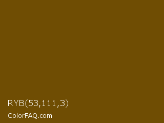 RYB 53,111,3 Color is a very dark orange color and the nearest color is Antique Bronze #704a07. Hex code #6f4d03 and RGB value is rgb(111,77,3). In RGB color space, this color is composed of 44% red, 30% green, 1% blue, In CMYK color space, this color is composed of 0% cyan, 31% magenta, 97% yellow , 56% black , In HSL color space, this color has a hue angle of 41° , 95% saturation and 22% lightness.