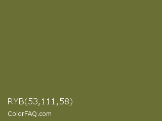 RYB 53,111,58 Color is a normal yellow color and the nearest color is Yellow Metal #716338. Hex code #6a6f35 and RGB value is rgb(106,111,53). In RGB color space, this color is composed of 42% red, 44% green, 21% blue, In CMYK color space, this color is composed of 5% cyan, 0% magenta, 52% yellow , 56% black , In HSL color space, this color has a hue angle of 65° , 35% saturation and 32% lightness.
