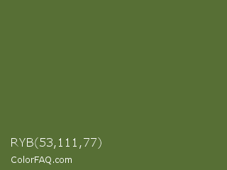 RYB 53,111,77 Color is a normal green color and the nearest color is Dark Olive Green #556b2f. Hex code #576f35 and RGB value is rgb(87,111,53). In RGB color space, this color is composed of 34% red, 44% green, 21% blue, In CMYK color space, this color is composed of 22% cyan, 0% magenta, 52% yellow , 56% black , In HSL color space, this color has a hue angle of 85° , 35% saturation and 32% lightness.