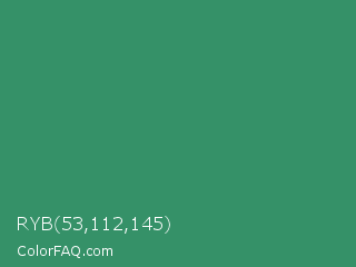 RYB 53,112,145 Color is a normal green color and the nearest color is Illuminating Emerald #319177. Hex code #359168 and RGB value is rgb(53,145,104). In RGB color space, this color is composed of 21% red, 57% green, 41% blue, In CMYK color space, this color is composed of 63% cyan, 0% magenta, 28% yellow , 43% black , In HSL color space, this color has a hue angle of 153° , 46% saturation and 39% lightness.