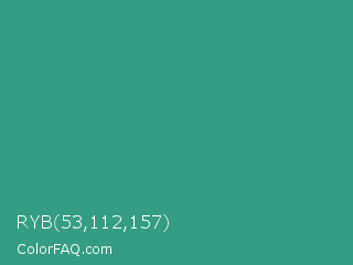 RYB 53,112,157 Color is a normal cyan color and the nearest color is Zomp #39a78e. Hex code #359d84 and RGB value is rgb(53,157,132). In RGB color space, this color is composed of 21% red, 62% green, 52% blue, In CMYK color space, this color is composed of 66% cyan, 0% magenta, 16% yellow , 38% black , In HSL color space, this color has a hue angle of 166° , 50% saturation and 41% lightness.