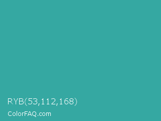 RYB 53,112,168 Color is a normal cyan color and the nearest color is Keppel #3ab09e. Hex code #35a8a2 and RGB value is rgb(53,168,162). In RGB color space, this color is composed of 21% red, 66% green, 64% blue, In CMYK color space, this color is composed of 68% cyan, 0% magenta, 4% yellow , 34% black , In HSL color space, this color has a hue angle of 177° , 52% saturation and 43% lightness.