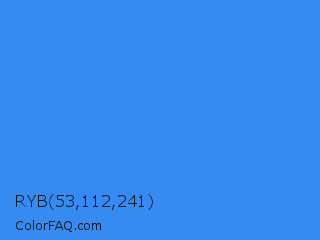 RYB 53,112,241 Color is a normal blue color and the nearest color is Bleu De France #318ce7. Hex code #358bf1 and RGB value is rgb(53,139,241). In RGB color space, this color is composed of 21% red, 55% green, 95% blue, In CMYK color space, this color is composed of 78% cyan, 42% magenta, 0% yellow , 5% black , In HSL color space, this color has a hue angle of 213° , 87% saturation and 58% lightness.