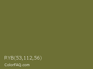 RYB 53,112,56 Color is a normal yellow color and the nearest color is Yellow Metal #716338. Hex code #6d7035 and RGB value is rgb(109,112,53). In RGB color space, this color is composed of 43% red, 44% green, 21% blue, In CMYK color space, this color is composed of 3% cyan, 0% magenta, 53% yellow , 56% black , In HSL color space, this color has a hue angle of 63° , 36% saturation and 32% lightness.