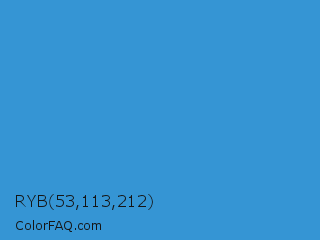 RYB 53,113,212 Color is a normal blue color and the nearest color is Tufts Blue #3e8ede. Hex code #3595d4 and RGB value is rgb(53,149,212). In RGB color space, this color is composed of 21% red, 58% green, 83% blue, In CMYK color space, this color is composed of 75% cyan, 30% magenta, 0% yellow , 17% black , In HSL color space, this color has a hue angle of 204° , 65% saturation and 52% lightness.