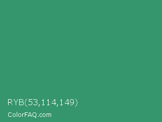 RYB 53,114,149 Color is a normal green color and the nearest color is Illuminating Emerald #319177. Hex code #35956c and RGB value is rgb(53,149,108). In RGB color space, this color is composed of 21% red, 58% green, 42% blue, In CMYK color space, this color is composed of 64% cyan, 0% magenta, 28% yellow , 42% black , In HSL color space, this color has a hue angle of 154° , 48% saturation and 40% lightness.