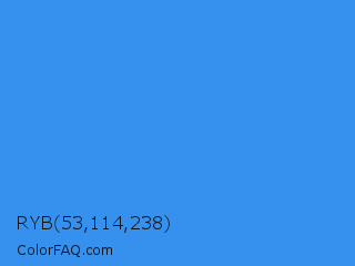 RYB 53,114,238 Color is a normal blue color and the nearest color is Bleu De France #318ce7. Hex code #3590ee and RGB value is rgb(53,144,238). In RGB color space, this color is composed of 21% red, 56% green, 93% blue, In CMYK color space, this color is composed of 78% cyan, 39% magenta, 0% yellow , 7% black , In HSL color space, this color has a hue angle of 210° , 84% saturation and 57% lightness.